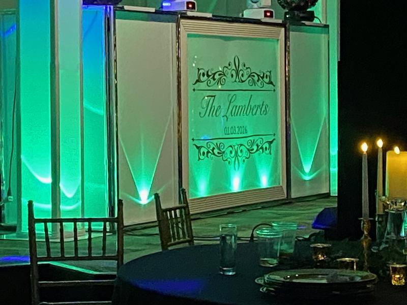 Our Illuminated glowing front façade custom 10-12 ft designed panels are prepared to initially compliment your special event (i.e. bridal palate colors, Mardi Gras colors etc.). This will progress during the event into an amazing romantic and fun lightshow at our skilled direction.