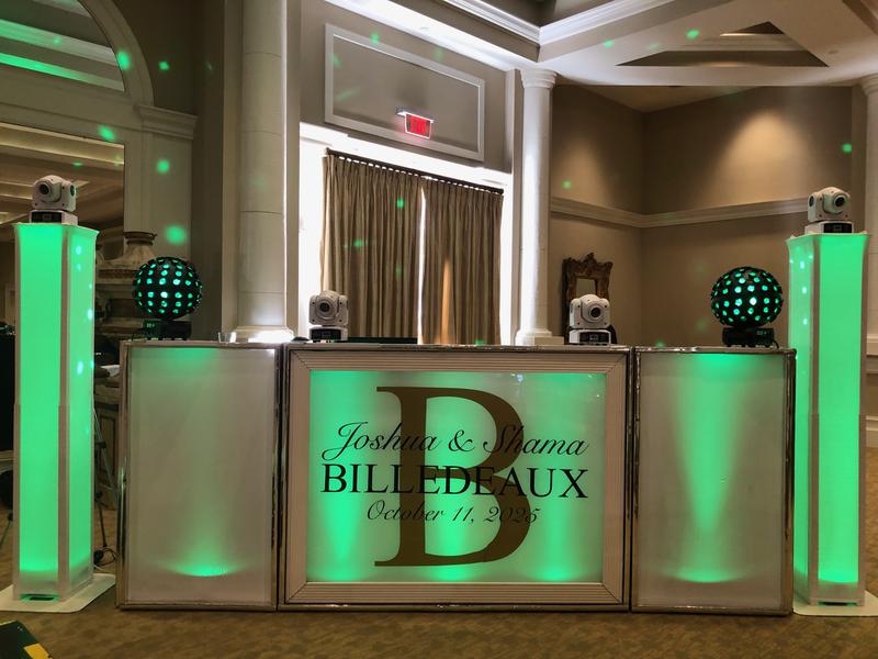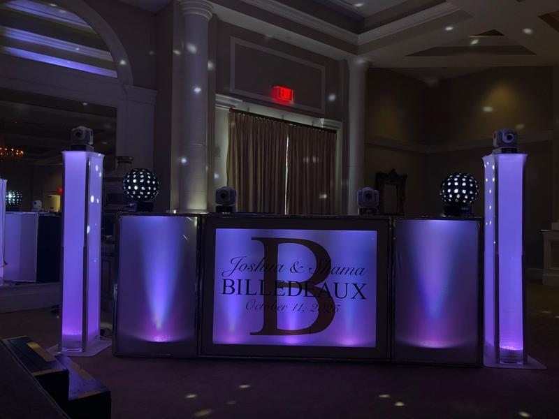 Our Illuminated glowing front façade custom designed panels are prepared to initially compliment your special event (i.e. bridal palate colors, Mardi Gras theme colors, etc...). This will progress during your event into an amazing light show at our skilled direction.