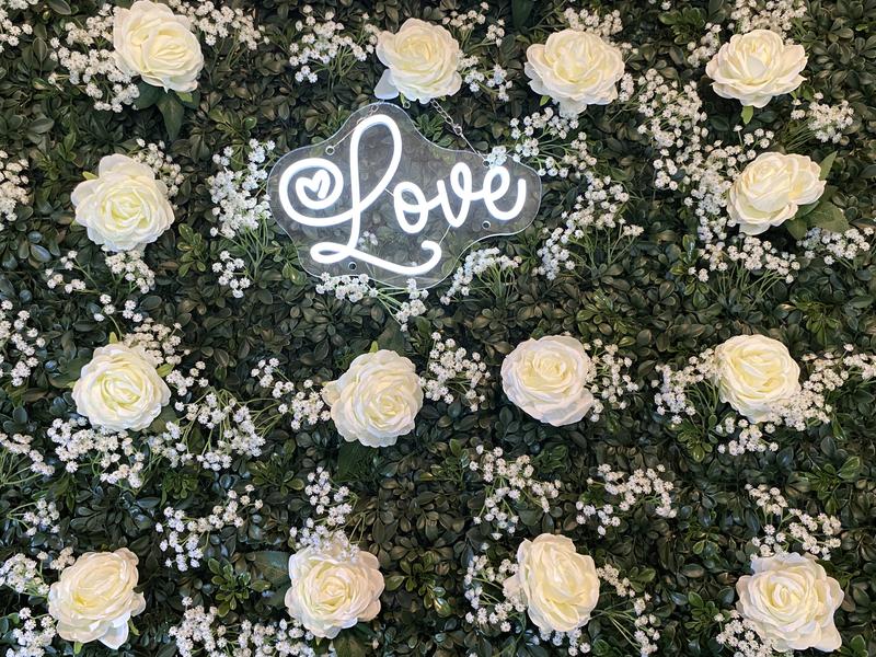 We will arrange for obtaining a preapproved customized "last name" lightweight neon (LED) sign, all necessary hardware needed to set it up and hang it onto either the Wedding White Floral Wall or the Green Hedge Wall options, if you select this service. Add $150 more if you wish for us to be responsible for this service. (Must be prepaid in advance.) Just remember to arrange to take your customized sign home with you to enjoy after your event ends.
