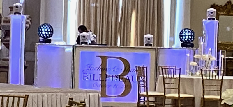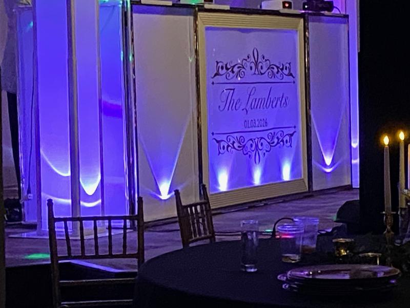 Our Illuminated glowing front façade custom 10-12 ft designed panels are prepared to initially compliment your special event (i.e. bridal palate colors, Mardi Gras colors etc.). This will progress during the event into an amazing lightshow at our skilled direction.