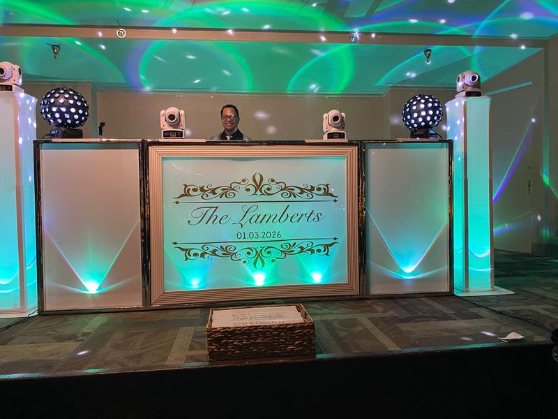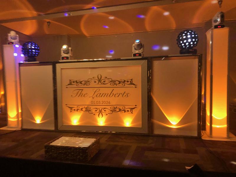 - Our elegantly customized 10 ft. wedding white DJ Front Panels.